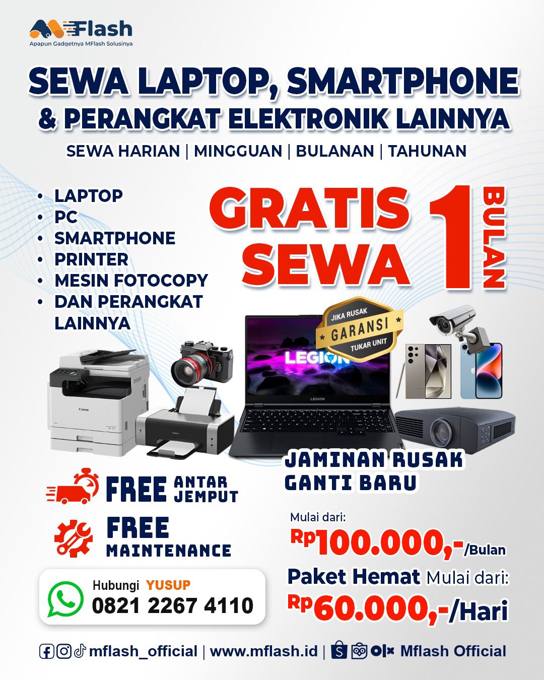 Khusus untuk sewa laptop perusahaan, biaya sewa laptop sudah termasuk biaya spare part dan servis jika ada kerusakan. MFlash menyediakan dukungan IT untuk memperbaiki laptop jika ada masalah. Layanan perbaikan mungkin akan dibebankan ke penyewa jika kerusakan terjadi akibat kelalaian pengguna.